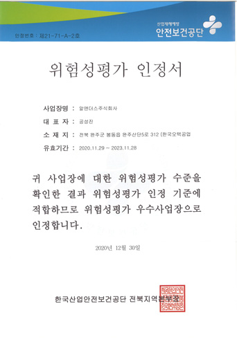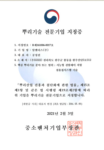 전북 완주군 봉동읍 완주산단 5로 312번지 / 고객센터 : 063-262-7900 / 사업자 번호 : 402-81-41278 / 상호 : 알앤더스(주) / 대표이사 : 공성진 주소: 본사 및 1공장_전북 완주군 봉동읍 완주산단5로 312 / 2공장 전북 완주군 봉동읍 완주산단5로 202